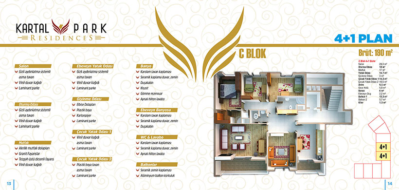İnşaat kalitesi en üst düzeyde olup. Ailenizin genişliğine göre farklı tiplerden oluşan dilediğiniz daire seçeneklerine sahip, Şehrin hızla gelişen bölgesinde ve şehir gürültüsünün olmadığı huzurlu bir alanda... Mutfağından banyosuna büyük bir titizlikle ve özenle tasarlanan daireler. Demirden betona, yalıtımdan duvar kağıdına her ürün usta eller ayrıcalığıyla uygulanıyor.